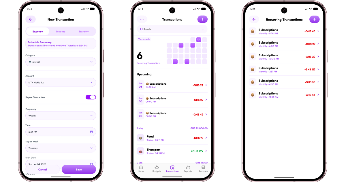 Whether it's your monthly Spotify subscription, or your paycheck, Purple can now populate transactions automatically on a schedule. Set it once, and let Purple handle the rest.